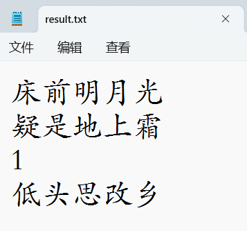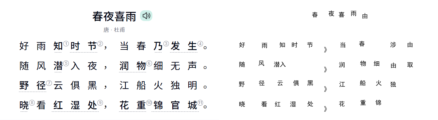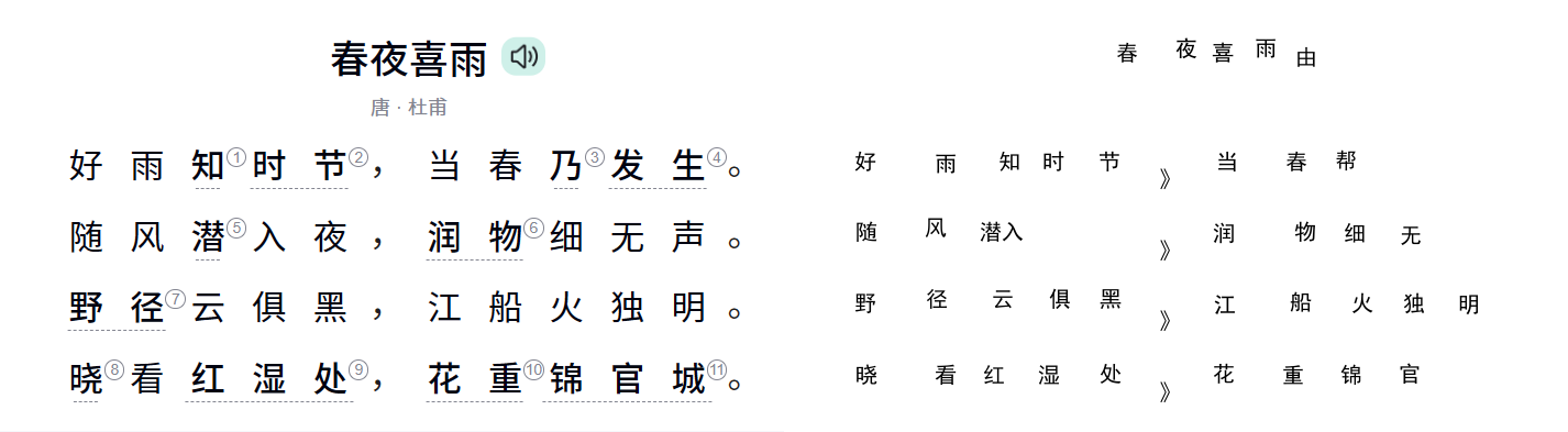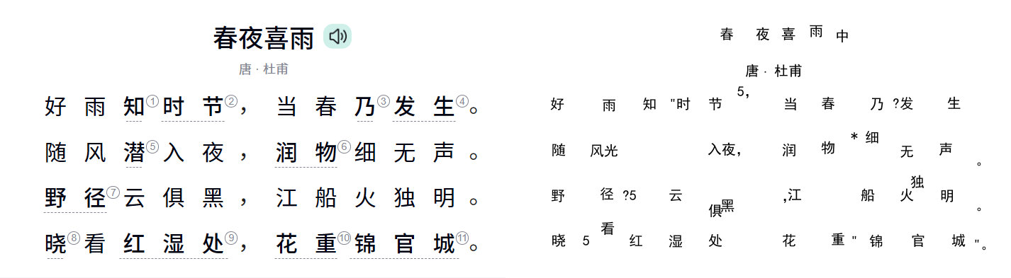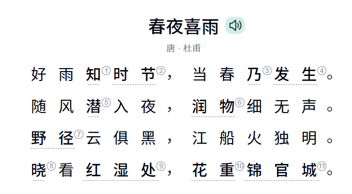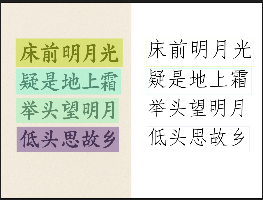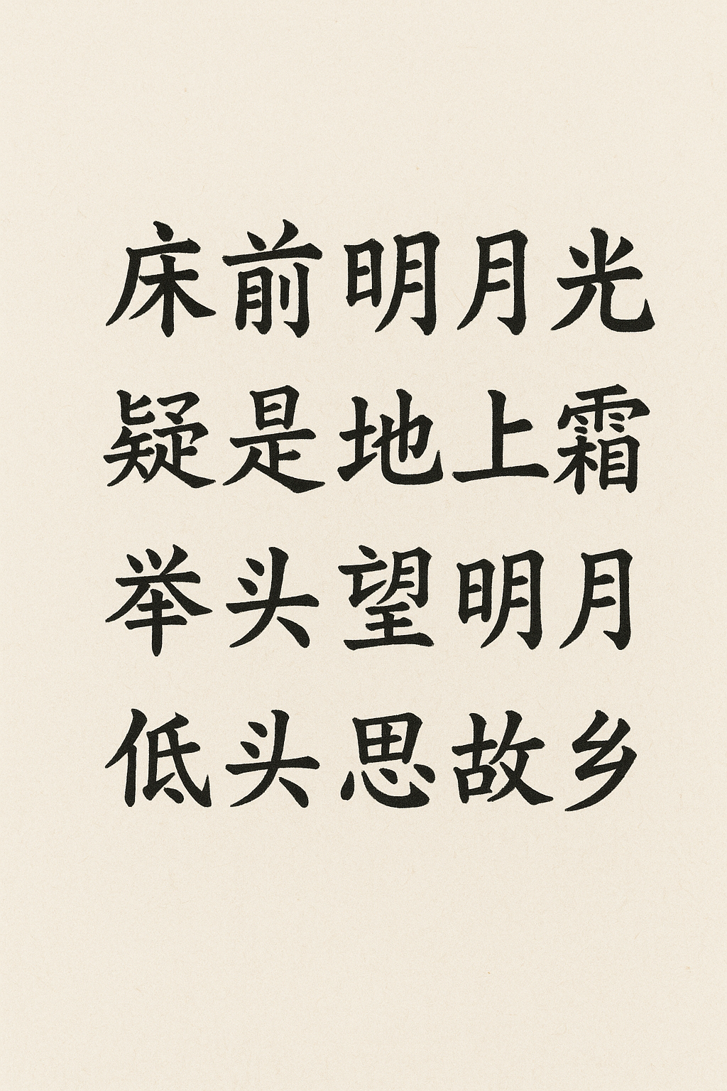 'text': ['', '', '', '', '床', '前', '明月', '光', '', '疑', '是', '地', '上', '霜', '', '汪汪', '明月', '', '低头', '思', '故', '乡']